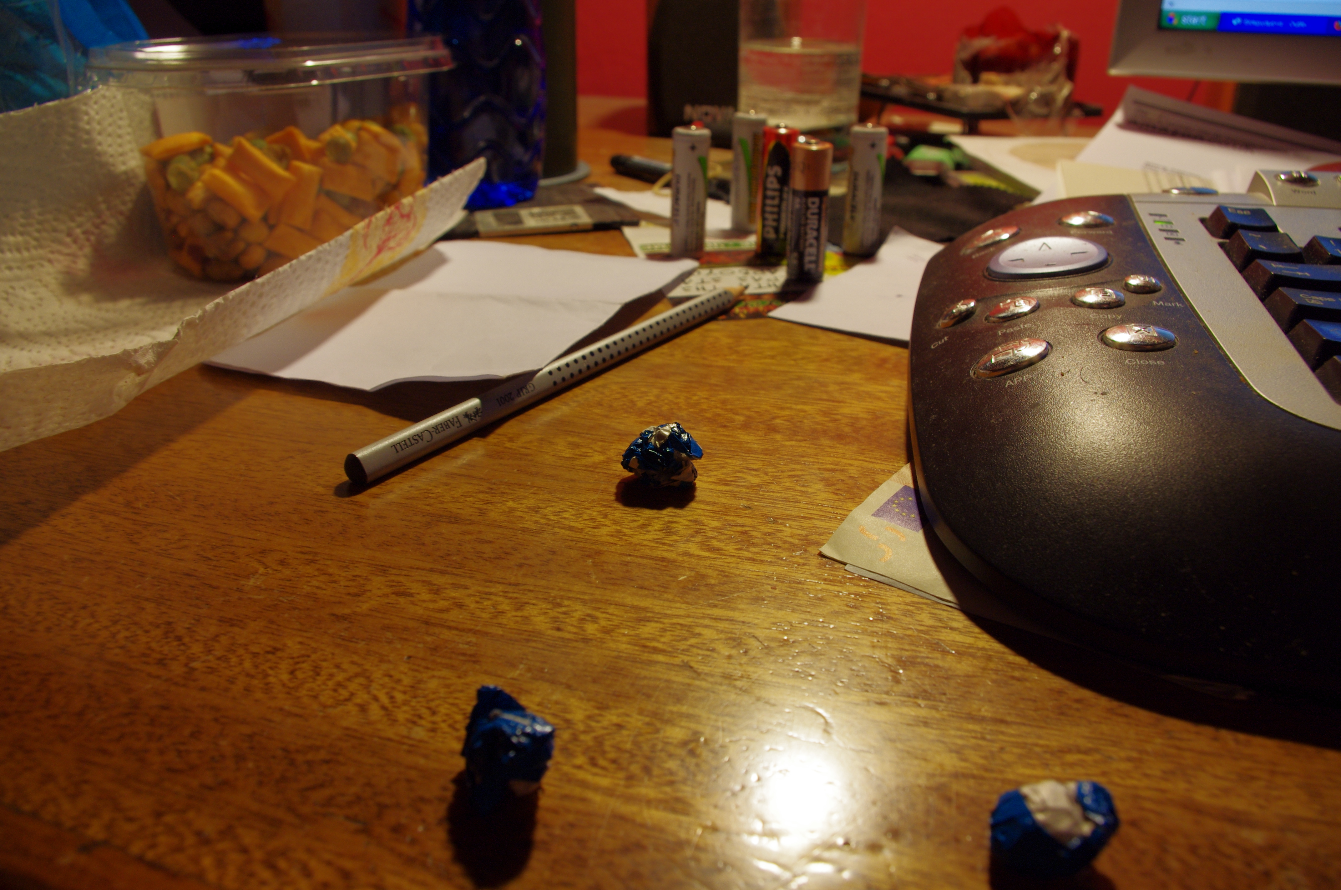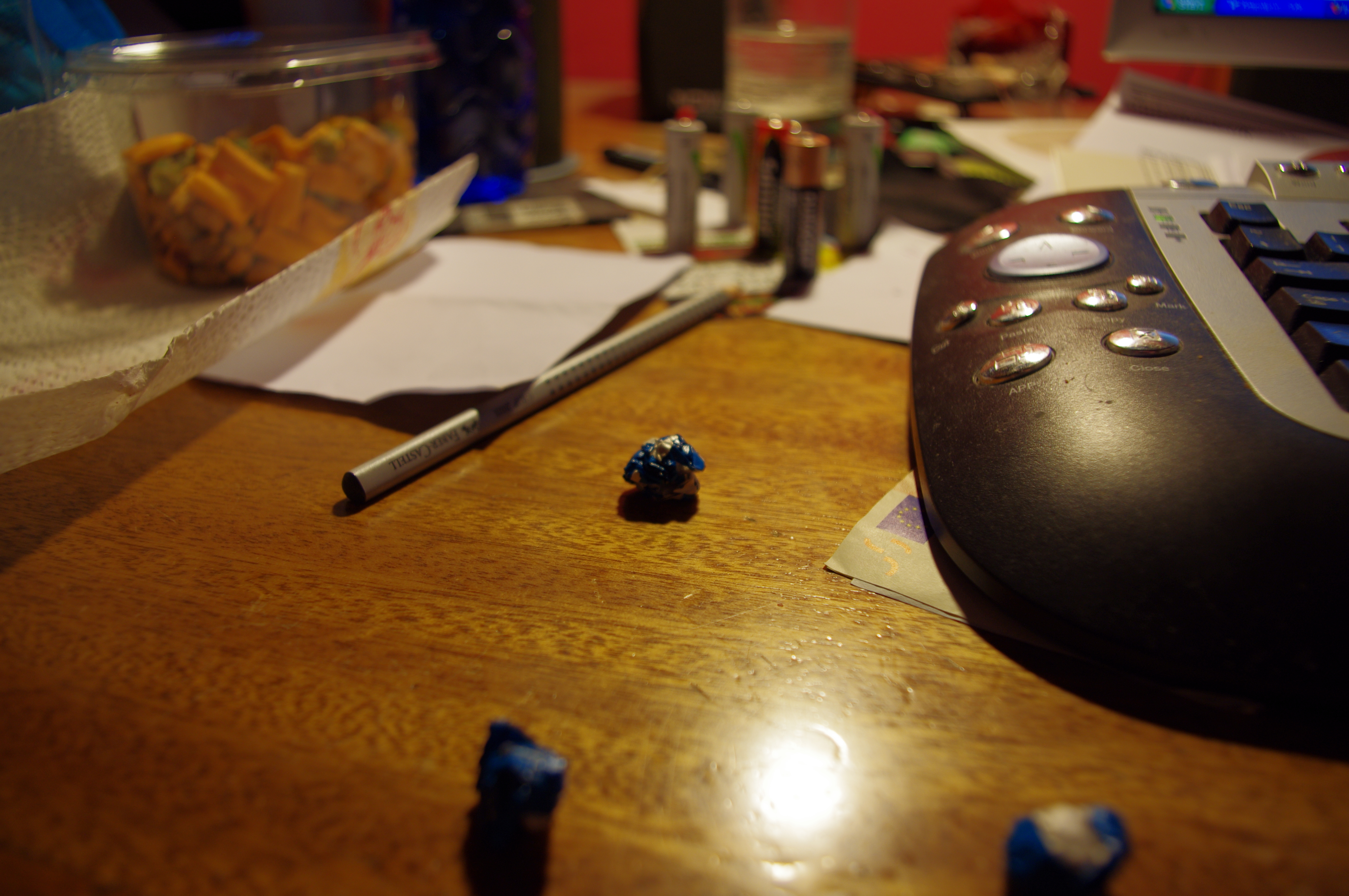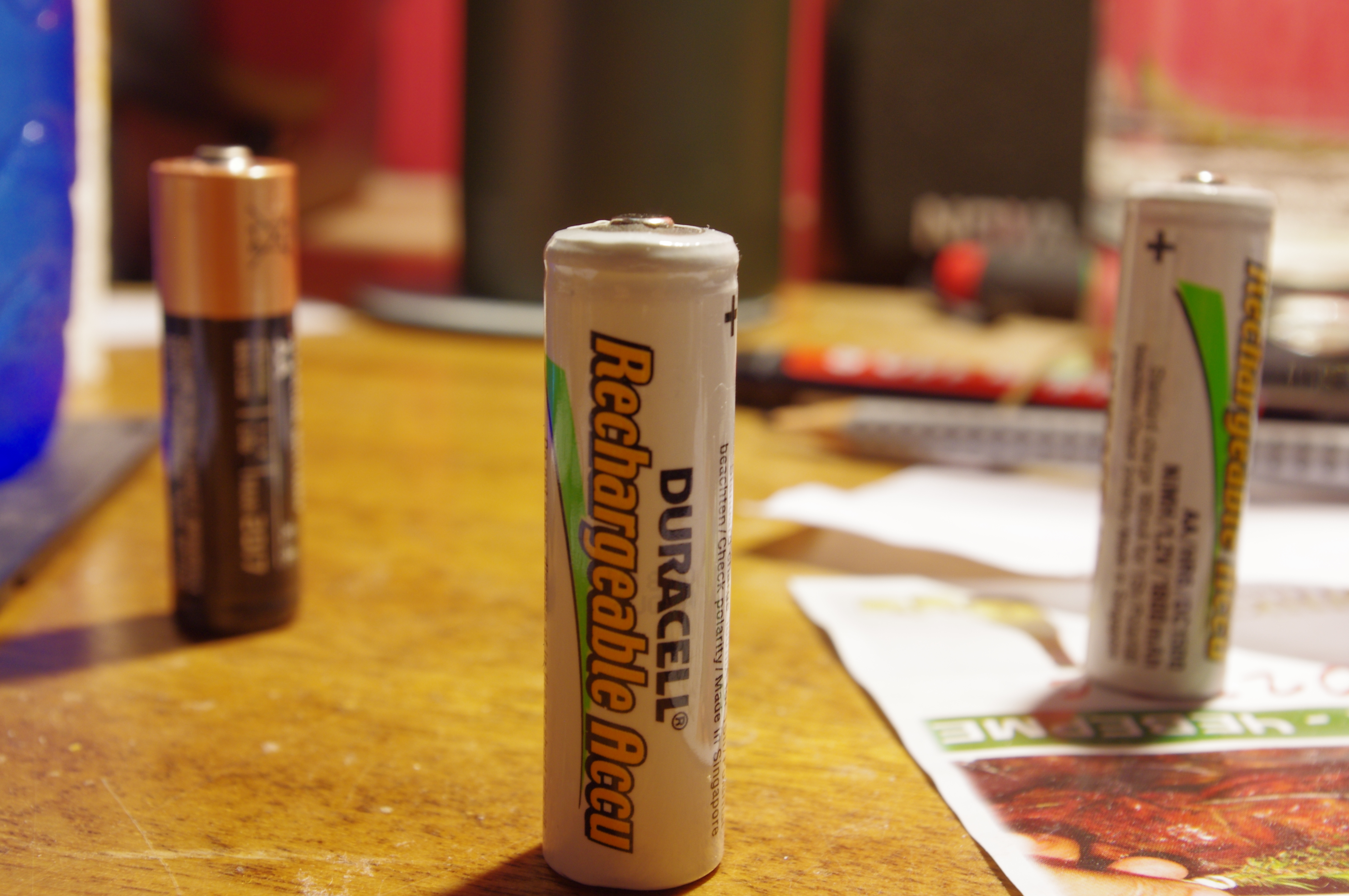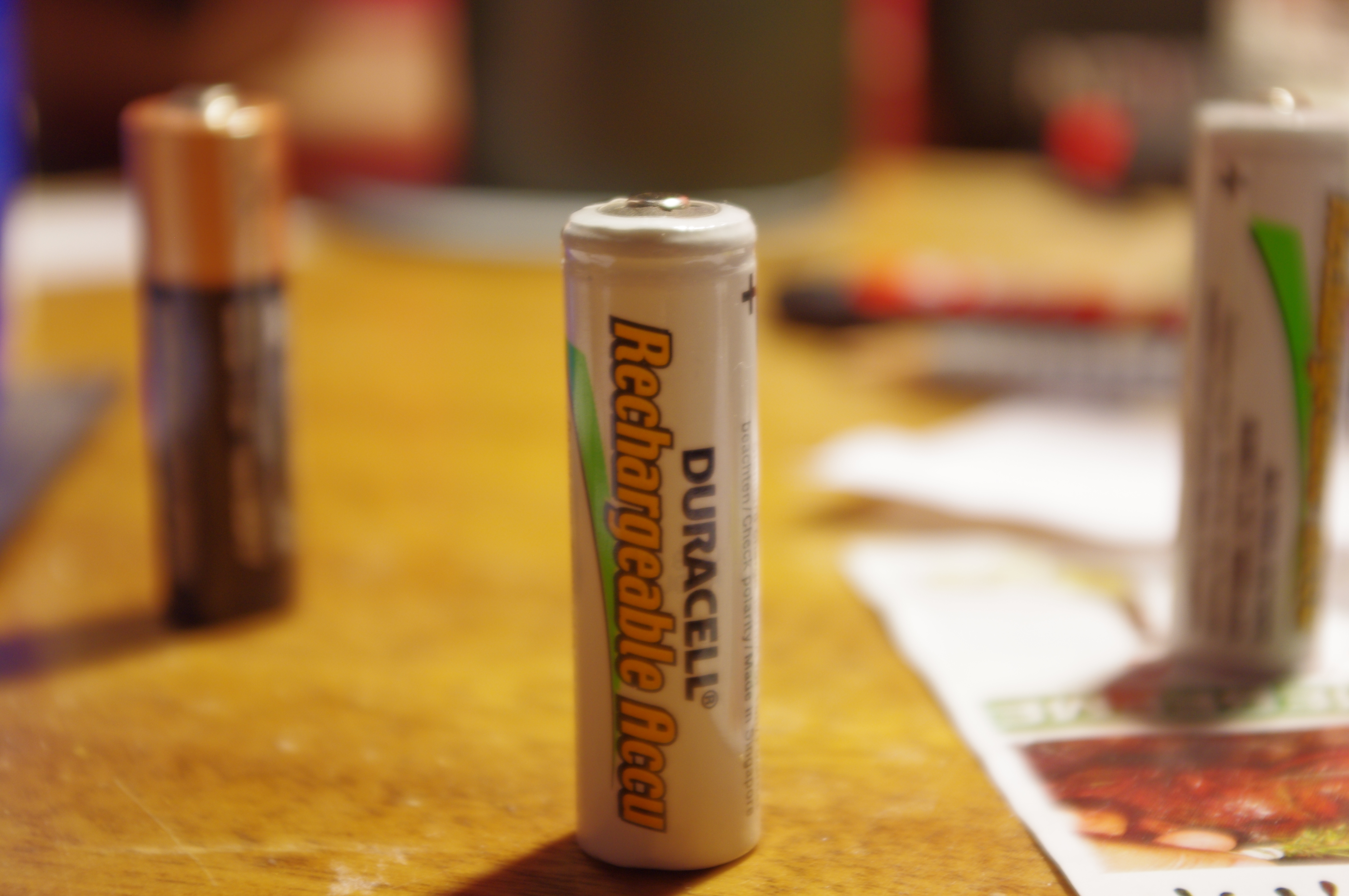 Εστιακό μήκος φακού 50mm, διάφραγμα 5.6, ISO 400. Η μπαταρία παρουσιάζει σχεδόν το ίδιο μέγεθος με την από πάνω φωτογραφία αλλά εξαιτίας του μεγαλύτερου εστιακού μήκους του φακού, όπως και του μικρότερου f (μεγαλύτερο διάφραγμα), έχει περιορισμένο βάθος πεδίου και βάθος εστίασης. Συγκεκριμένα το μπουκάλι με το νερό στα αριστερά δεν φαίνεται καθόλου, το ποτήρι με το νερό πίσω δεξιά ίσα που διακρίνεται, αλλά και οι άλλες δύο μπαταρίες που συνοδεύουν το κεντρικό αντικείμενο σκόπευσης την κεντρική μπαταρία είναι αρκετά θολές.