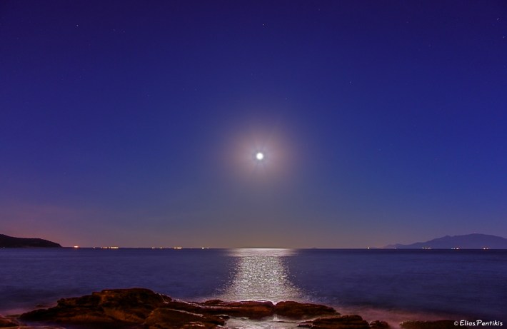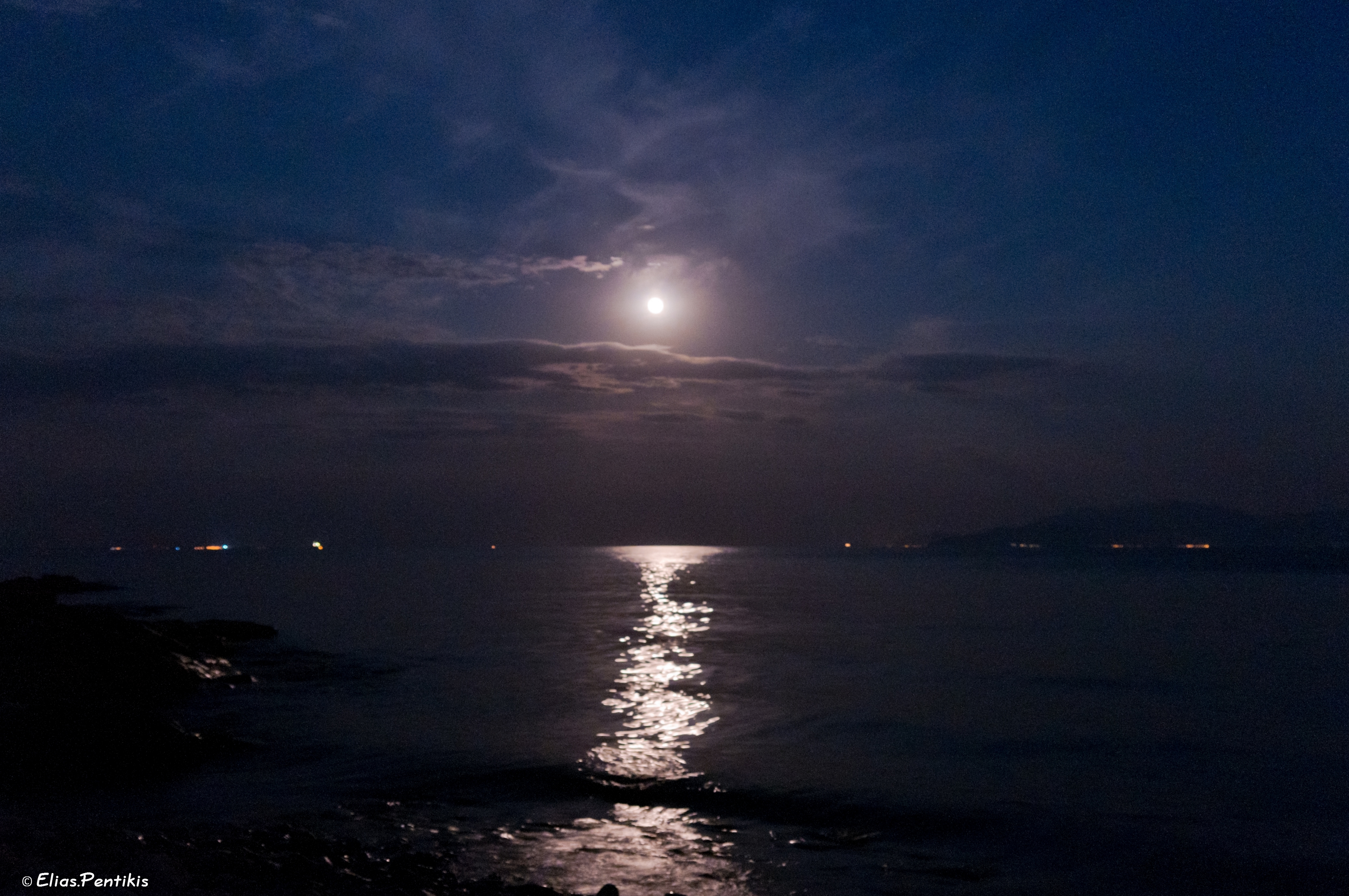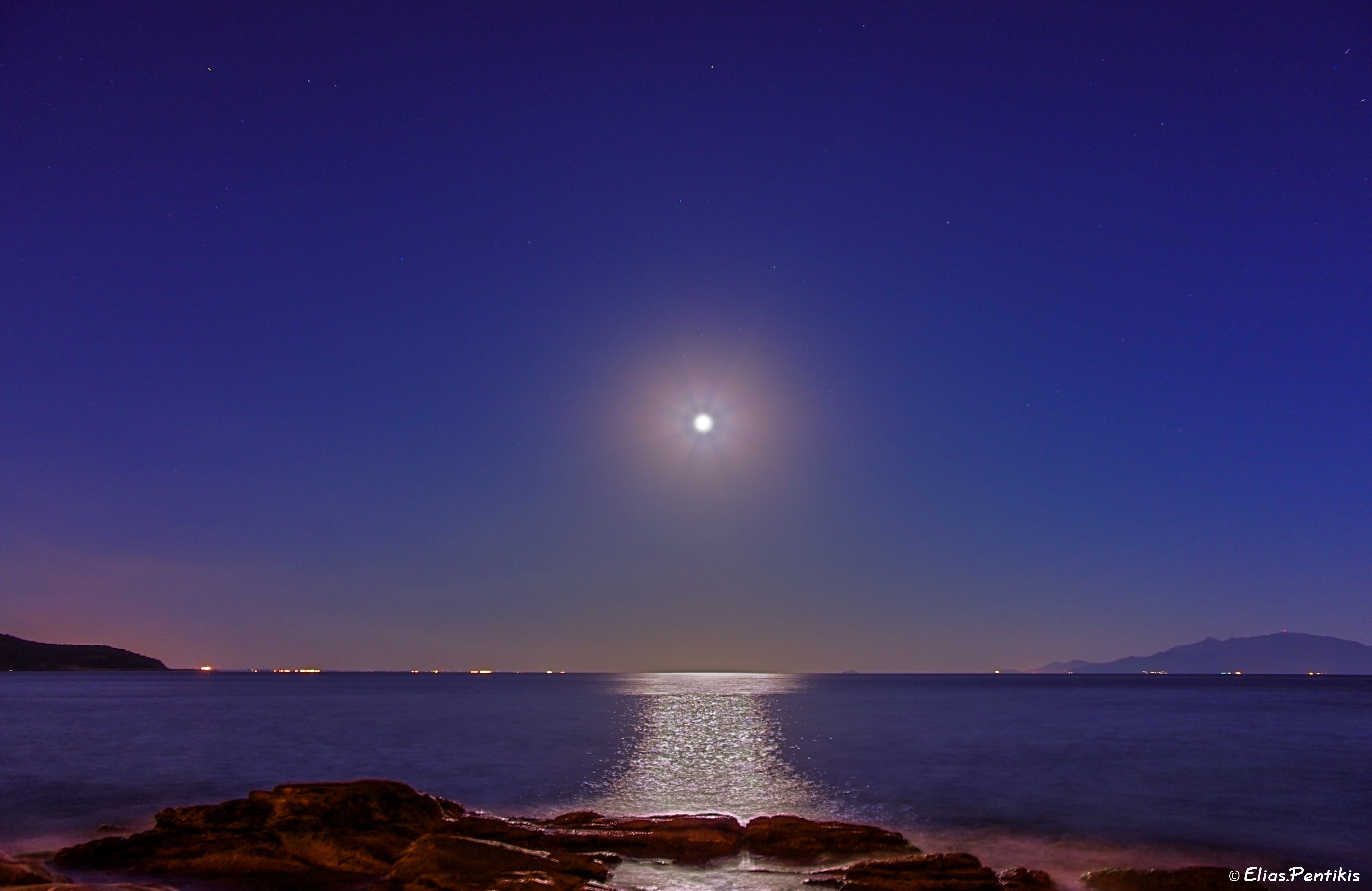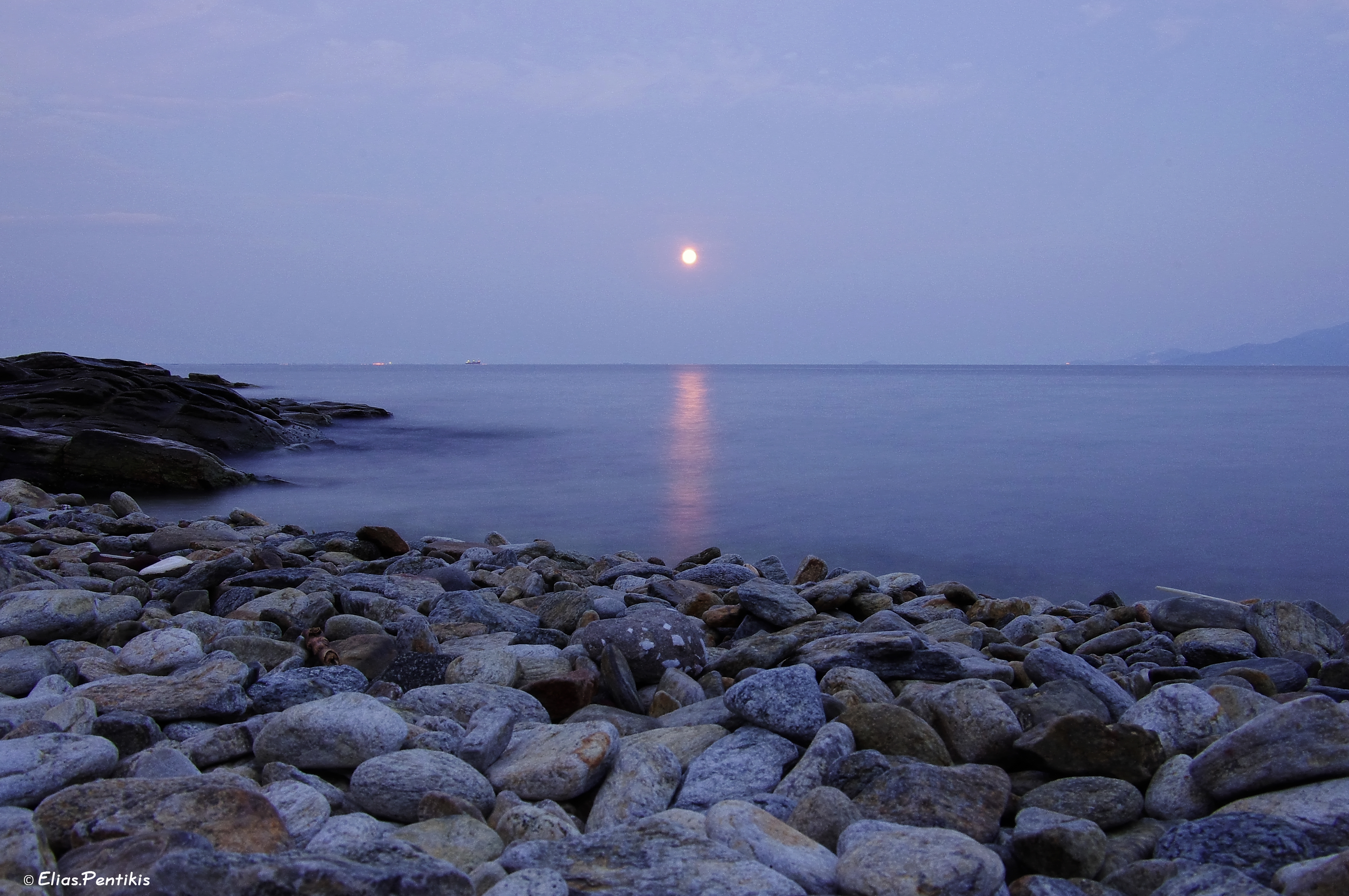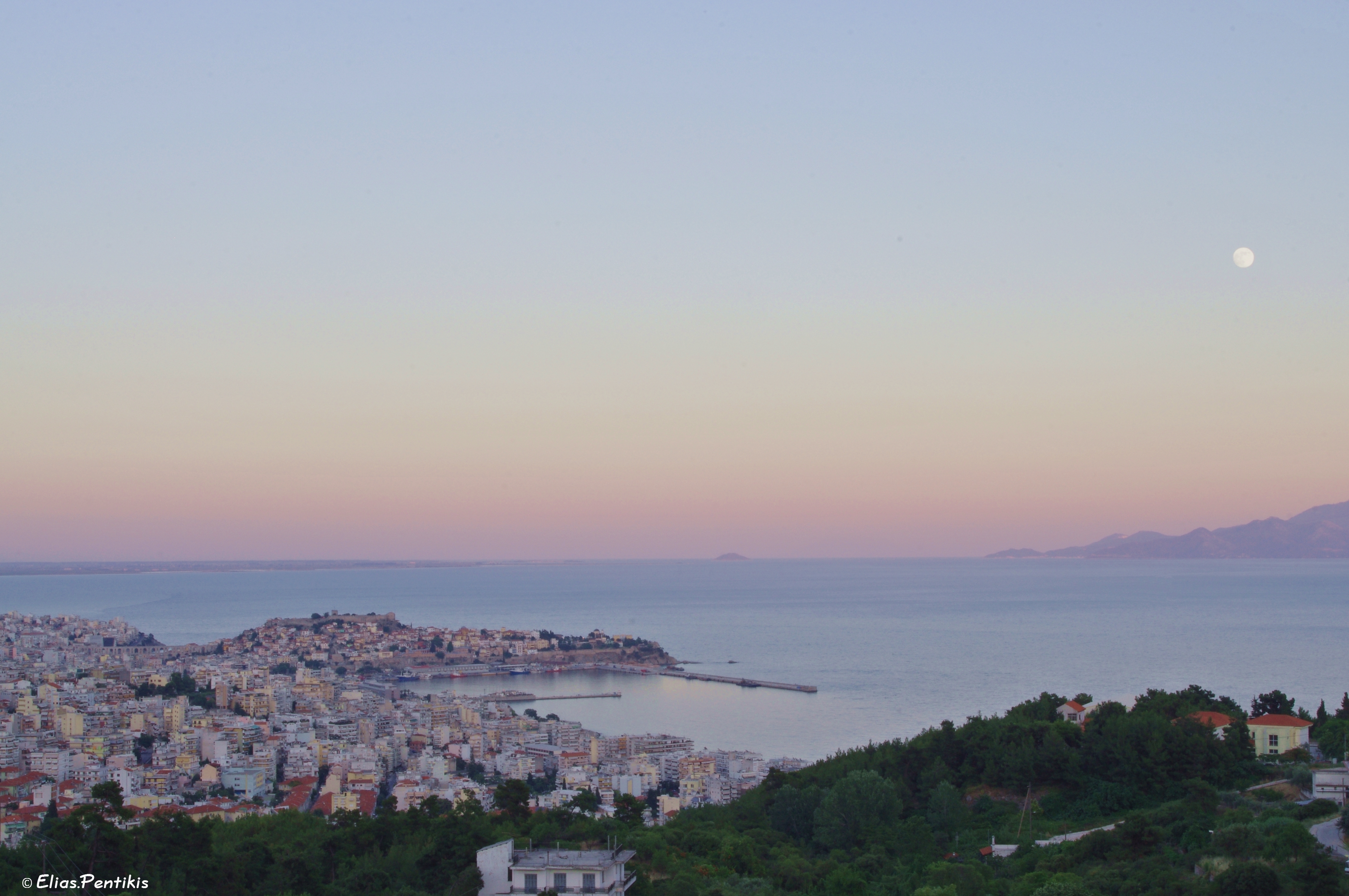 Two of my early shots, showing an almost full Moon hanging over the island of Thasos, opposing Kavala.